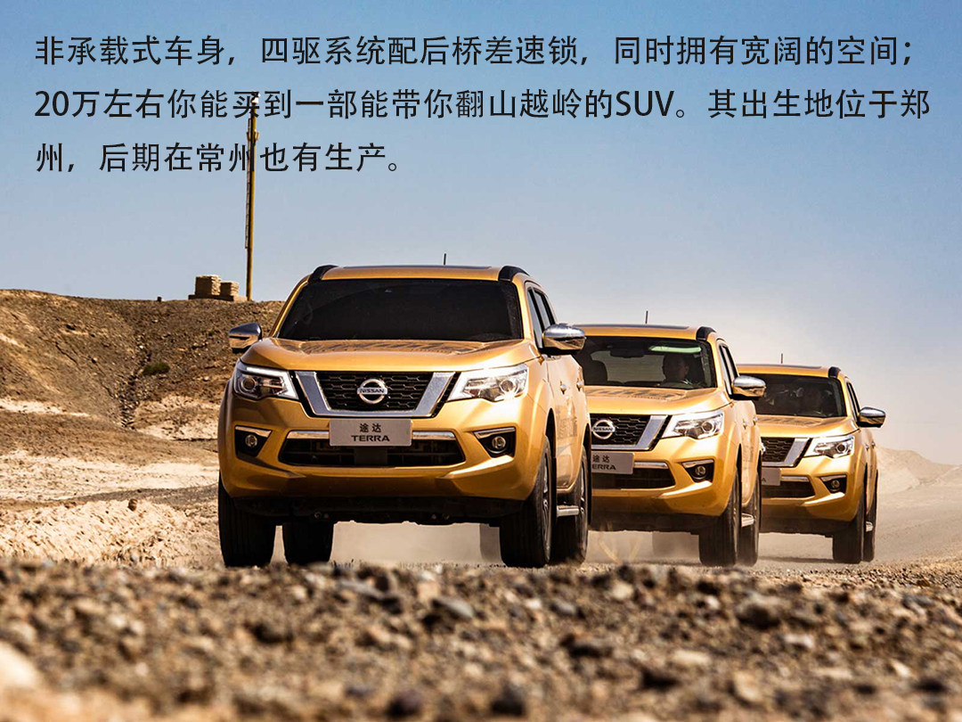 郑州日产的车型大多是商用车和特种车辆,直到去年终于推出了首款SUV途达,其基于纳瓦拉的平台打造,后桥配备牙嵌式差速锁,低速四驱模式下通过能力非常强悍,不少人赞它为:“20万能买到的途乐”。