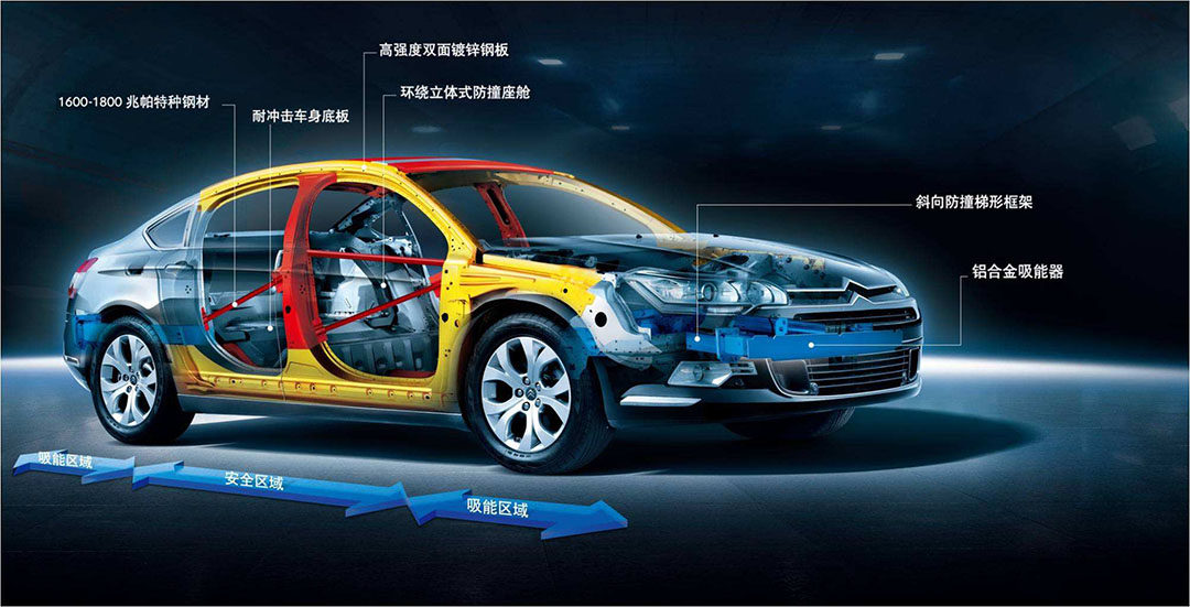 的确,一般乘用车为了应对安全测试和产品特性要求,车身都会大量采用超高强度钢材/高强度钢材,并且车身设计也十分讲究,吸能区、缓冲区、安全区分布合理,比如说这样的车身。