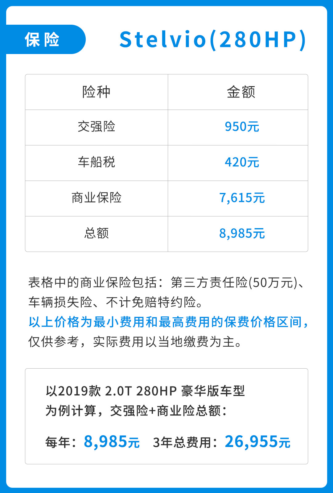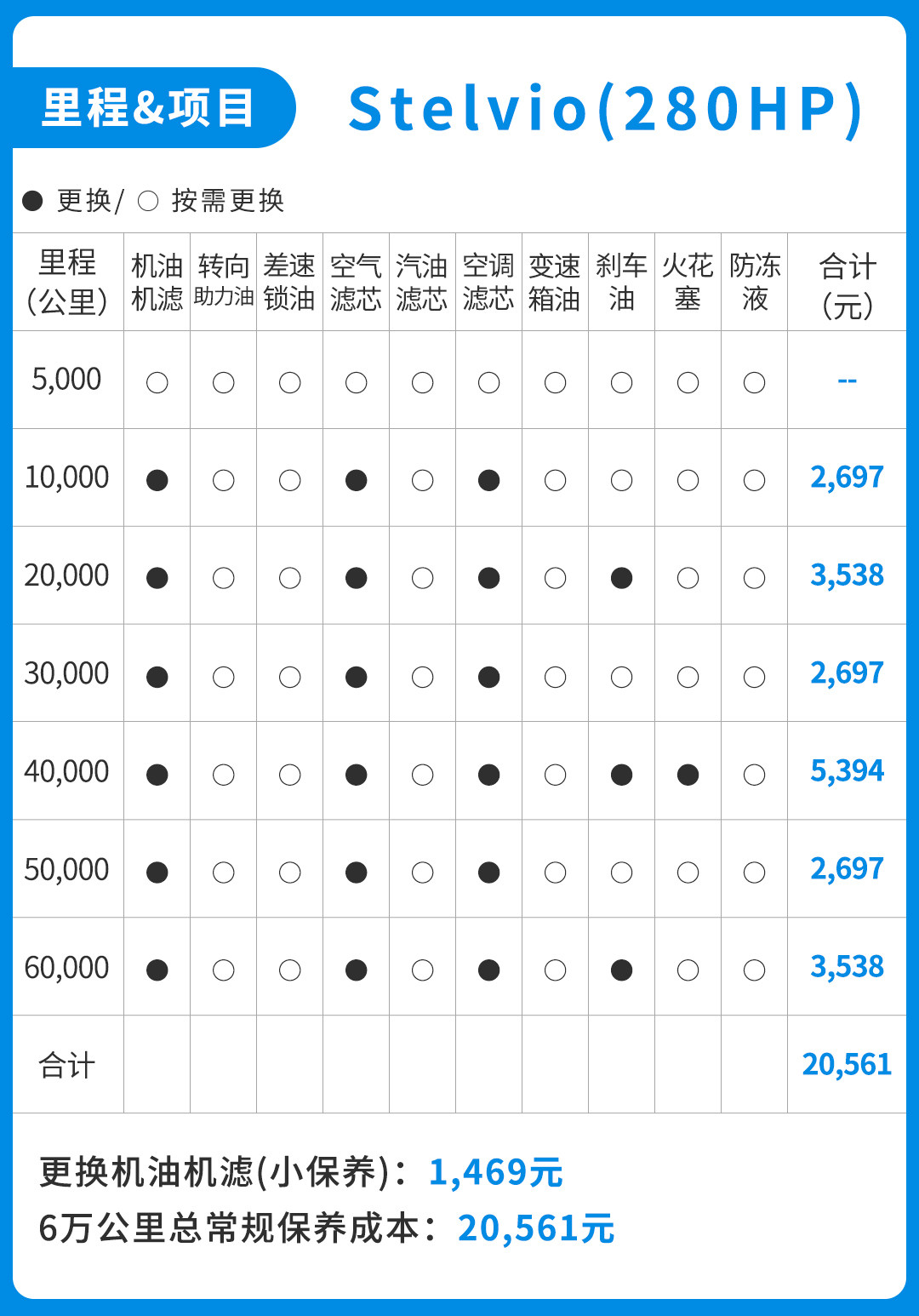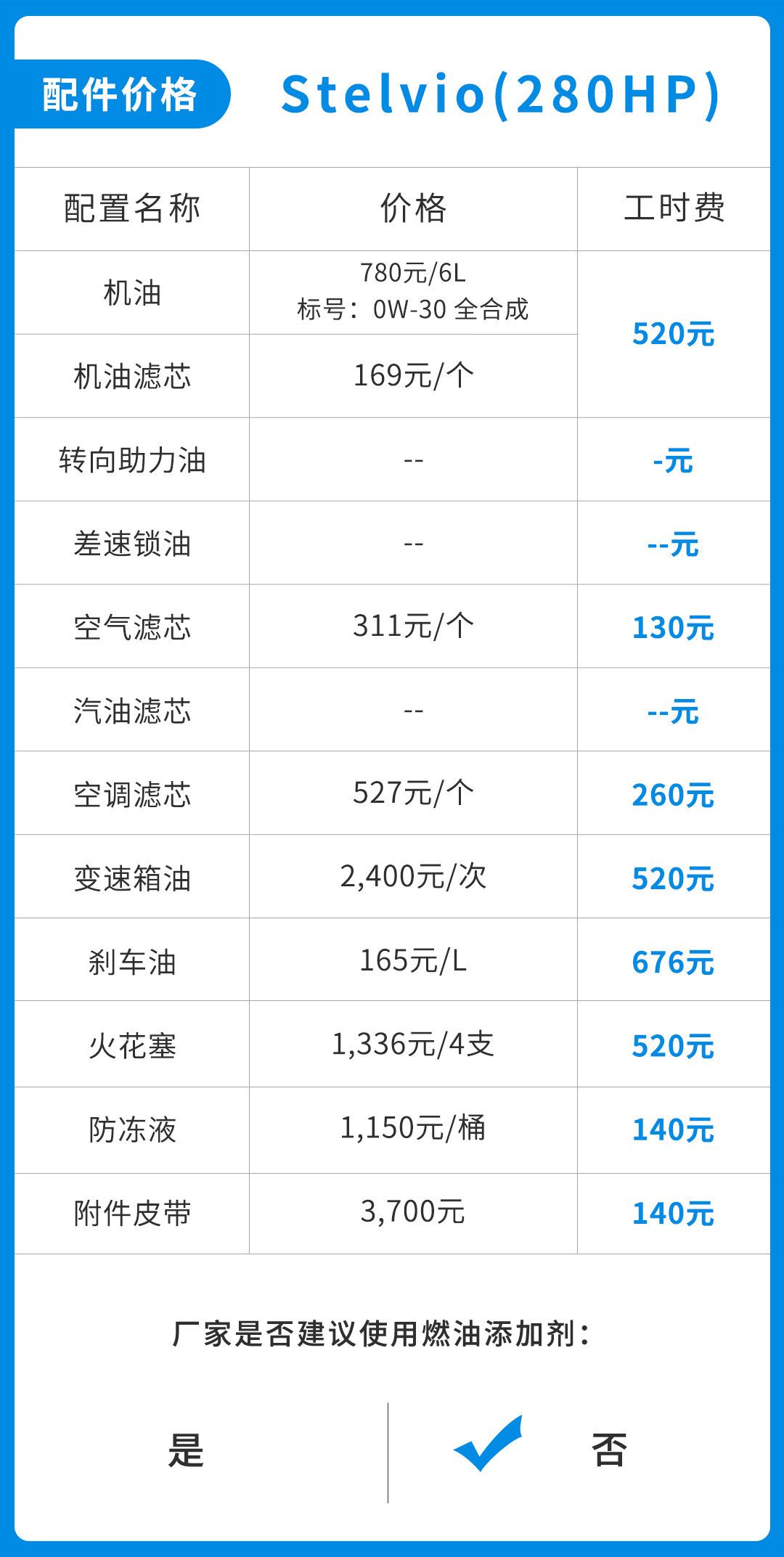 唔……怎么说好呢,保养费用挺高的,甚至高过“BBA”不少。并且根据笔者去4S店亲身了解到,目前国VI车型并没有任何优惠,而且似乎也不太想提供免费保养次数。但是说实话,如果阁下正在寻找一款老婆没意见、丈母娘坐得舒服、自己开得爽的车型,Stelvio绝对是最佳选择之一,只是目前无论价格还是后期保养费用都偏高,不妨等一等再去购买。