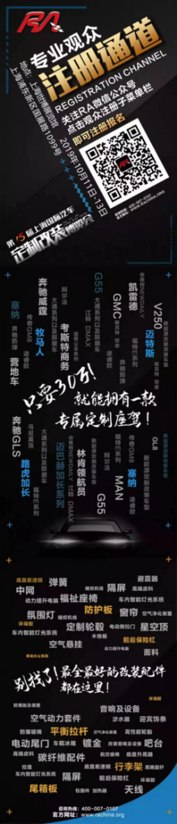 10月11日-13日,第十五届RA上海国际汽车定制改装博览会将在上海世博展览馆隆重呈现,组委会诚邀各界人士参加交流。专业人士可关注官方微信公众号:RA改装车,注册参观门票。