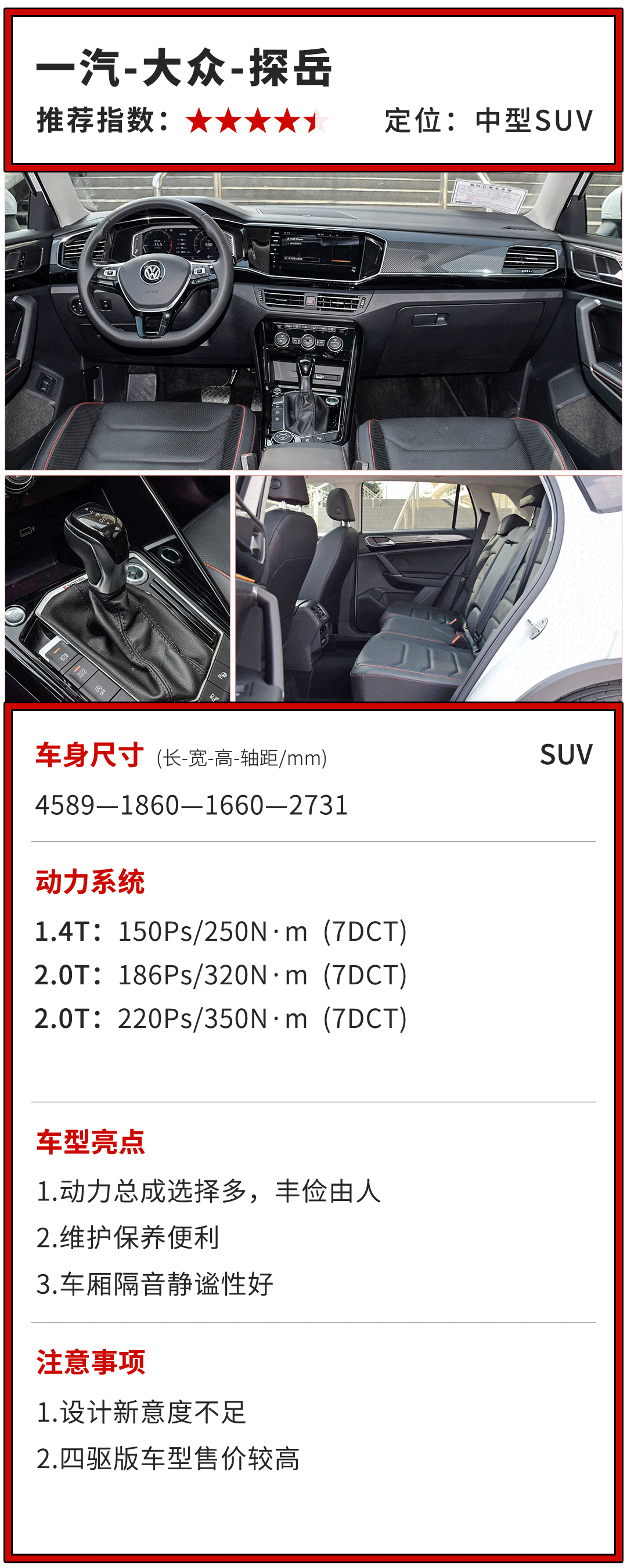 一汽-大众探岳的价格区间跨越了18-32万的级别,可谓丰俭由人,这是由于其提供了三种动力总成、两种驱动方式的组合供消费者选择,如果对动力要求不高,那么买1.4T两驱版车型就足够,而2.0T低功率两驱版车型则是教授最推荐购买的,动力不多不少刚刚好。至于2.0T高功率版,则均为四驱车型,需要较强动力,或者生活在北方的用户可以考虑。