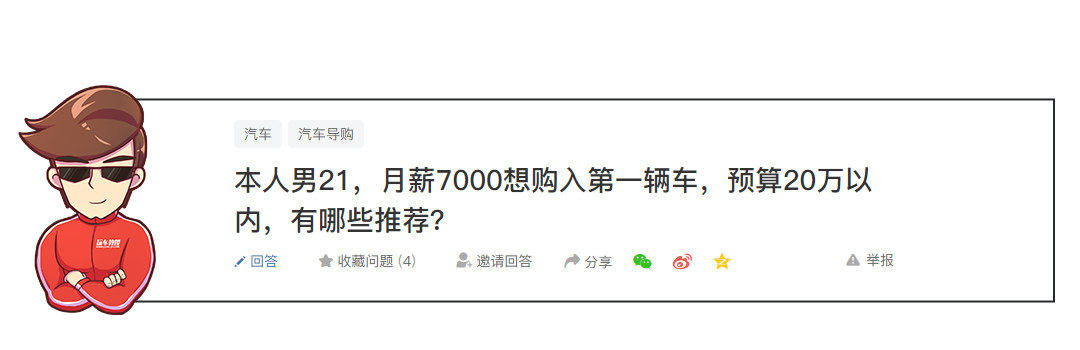 预算20万以内,考虑到月收入并不算太高个人推荐比较省心耐用的丰田卡罗拉。