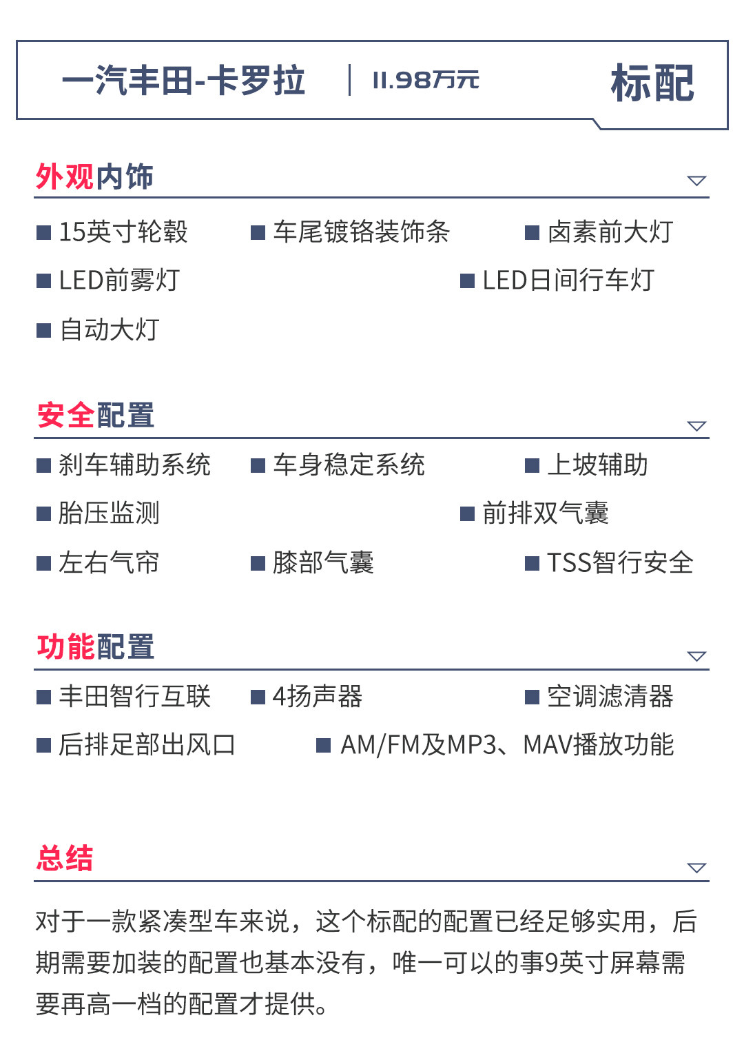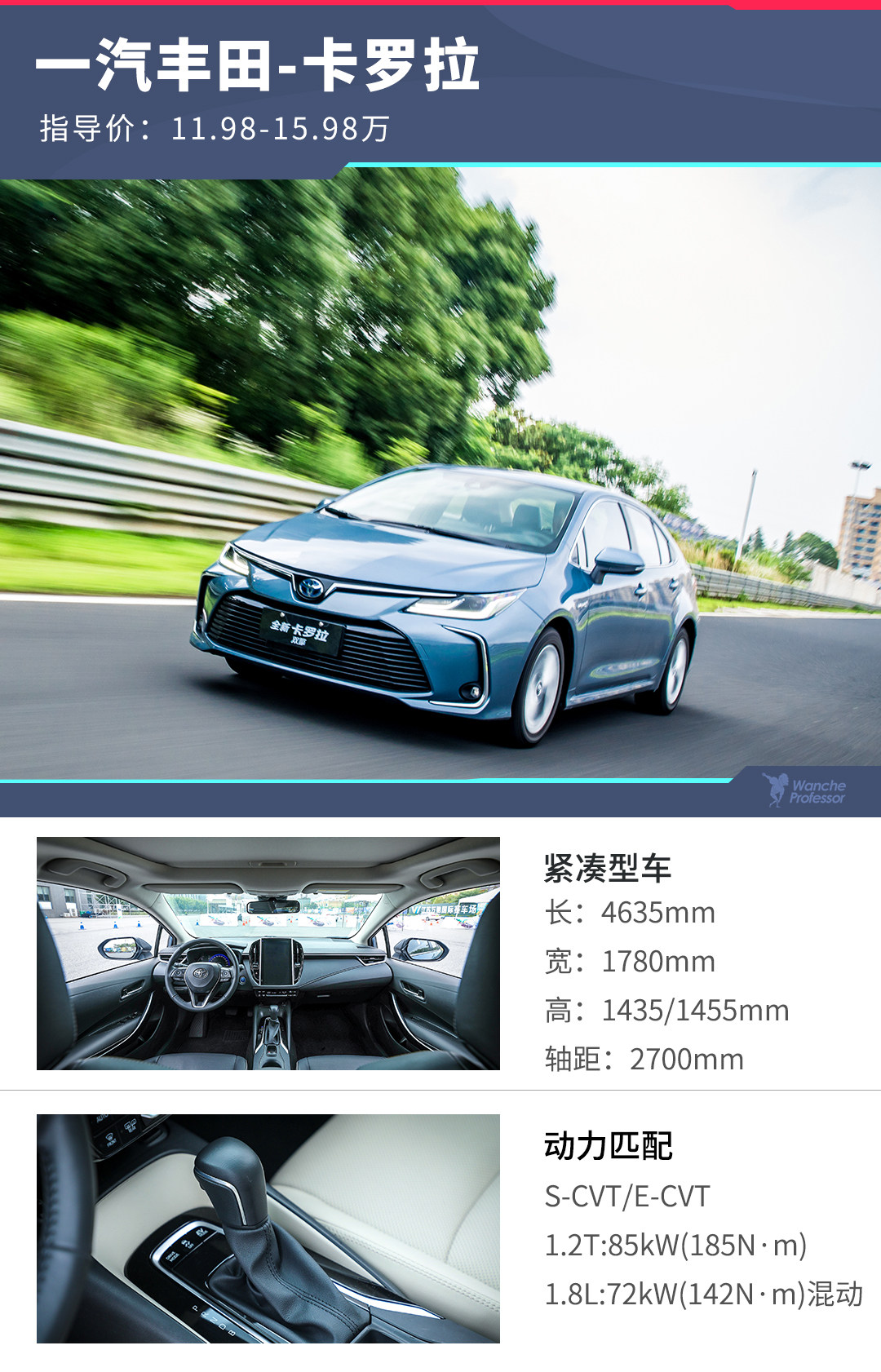 8月9日,一汽丰田旗下的第十二代卡罗拉正式上市,这一代卡罗拉基于丰田的TNGA架构打造,所以在外形上会更富有动感,也非常符合丰田目前的设计趋势。新车共推出1.2T和1.8L双擎两种动力共8款车型,售价区间为11.98-15.98万元,其中1.2T车型售价区间为11.98-14.58万元,1.8L双擎车型售价区间为13.58-15.98万元。对于这样一款精致年轻的车型,怎样买才是最划算?教授已经帮你们做好了分析。