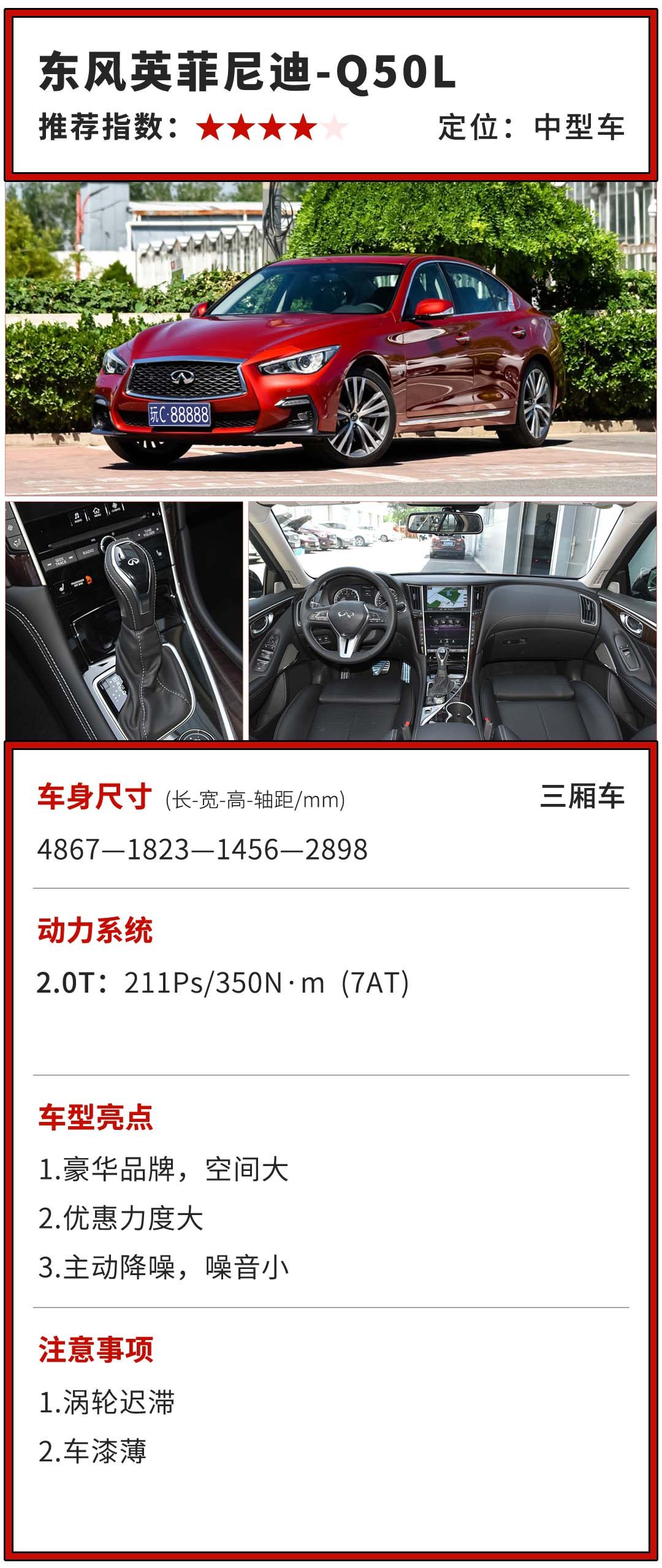 这款车是这一期唯一推荐的豪华品牌,对于豪华品牌来讲,隔音是提升车辆档次最有效的手段。英菲尼迪Q50L作为一款豪华品牌的车型,在门板、座椅、扶手等多处使用了大量的皮质材料,整车内饰都比较柔软,不易受到震动的影响。在降噪方面,最主要是得益于来自它的音响系统的主动降噪功能,直接抵消来自噪音的波段。