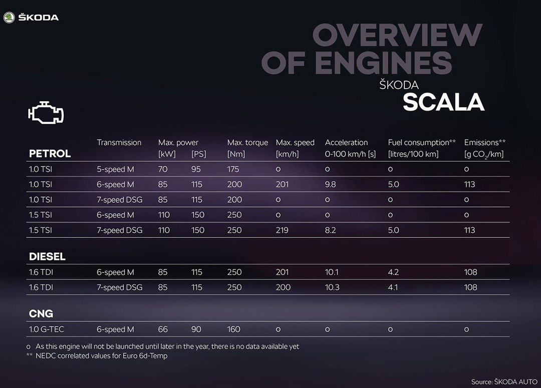 动力方面,SCALA依旧是大众集团对入门级紧凑型车的调性——小排量涡轮增压发动机。根据匹配的变速箱不同提供两种不同功率的1.0T发动机,其次便功率更高的是1.5T发动机、1.6T柴油发动机,还有以天然气为主燃料的1.0T三缸发动机。相信未来如果SCALA确定引入,将有很大几率采用1.5L以及1.4T发动机。