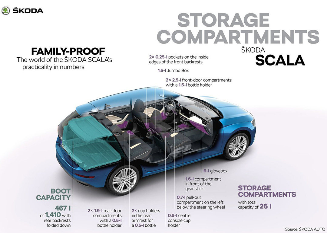 2649mm的轴距更为SCALA提供了可圈可点的后排空间表现。常规状态下后备厢容积为467L,后排放倒后更可扩充至1410L,SCALA空间以及装载能力的足以应付日常家用的需要。