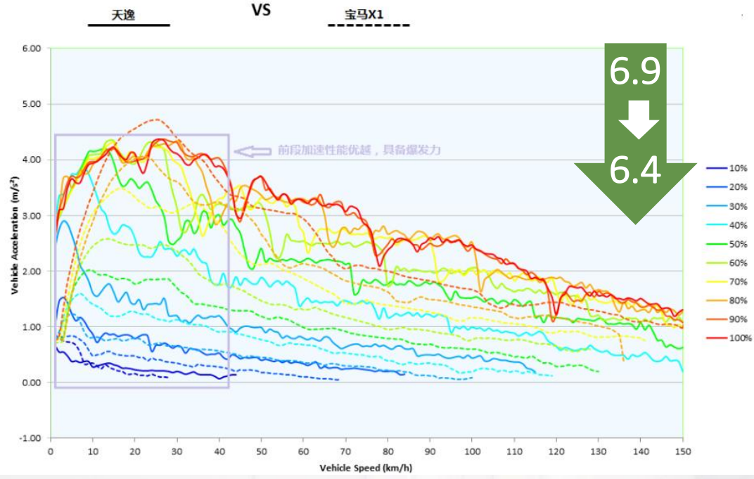 按照官方的说法,这套动力直接对标宝马X1,因为两者都用了爱信8AT变速箱。从加速度曲线看,雪铁龙这套动力除了10-28KM/H区间内,加速度略逊色X1外,其余范围都优于对方。