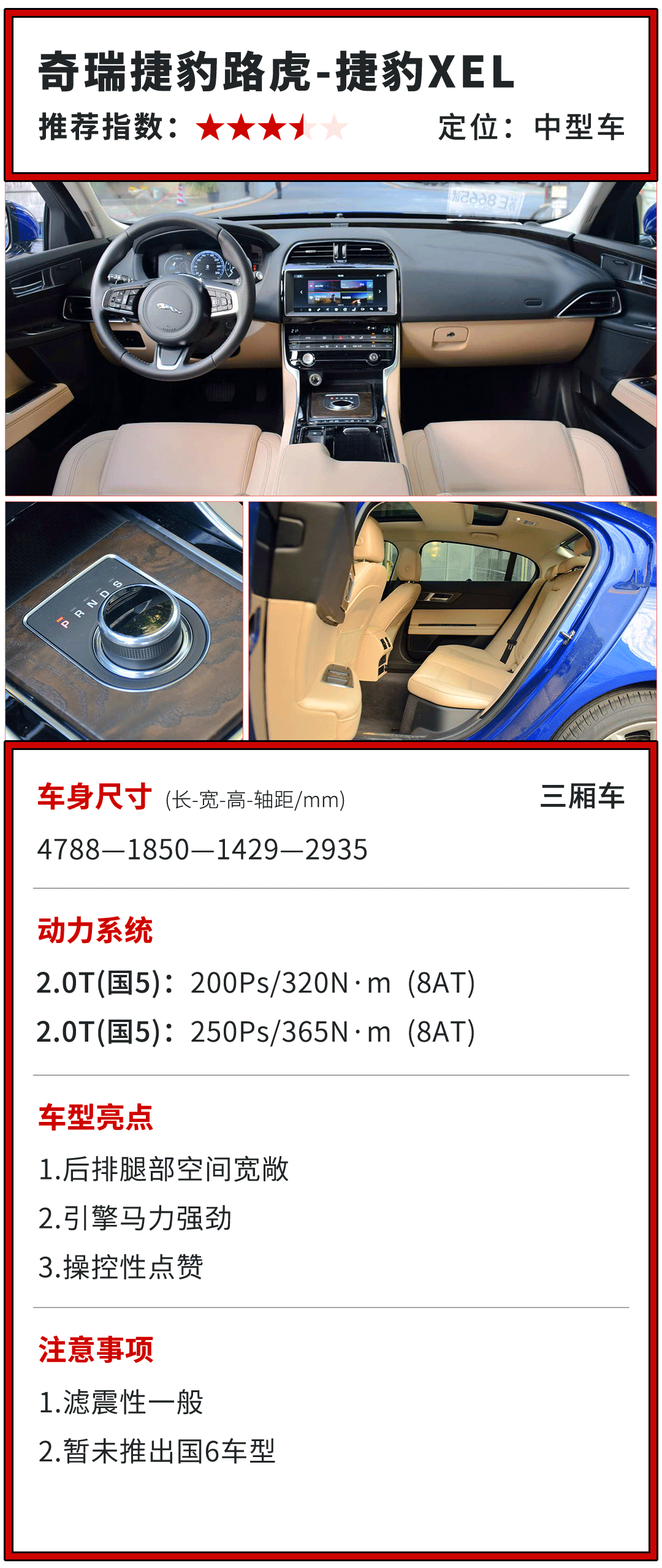捷豹XE在研发之初就视宝马3系为对手,因此配备着马力强劲的引擎,而且整车也非常注重操控性调校。国产后的捷豹XEL虽然加长了100mm的轴距,但依旧没也舍弃运动属性,转向手感依旧十分紧致,路感回馈清晰,车身跟随性优秀。2.0T引擎低/高功率版的动力仍为200/250马力,无论是操控性还是动力性都胜过了宝马3系。