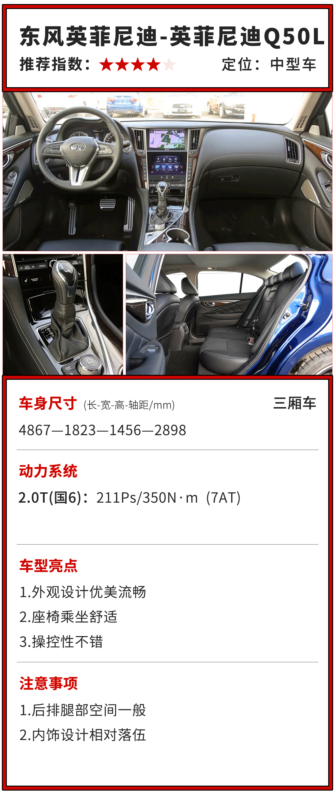 从数字上就能看出48mm的加长并不算多,要是比绝对空间大小,那肯定不是Q50L的强项。但好在其座椅继承了日产集团“大沙发”一贯的舒适性,整体感受还是挺不错的。动力方面则采用了与奔驰C级同源的2.0T引擎,马力在同级车里属于中游水准。教授认为,外观颜值是Q50L吸引用户的杀手锏,空间与性能则属于锦上添花的附属品。