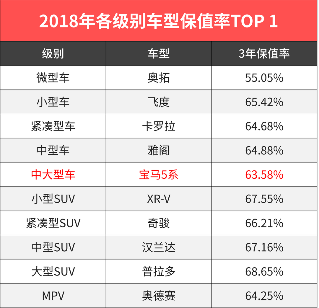 在中国汽车保值率研究委员会发布的《2018年中国汽车保值率报告》中,10个级别车型的保值率TOP 1有9个是日系车。唯一一个例外是中大型车级别,在这个级别里,日系车仅有皇冠一款车(只统计国产车型)。