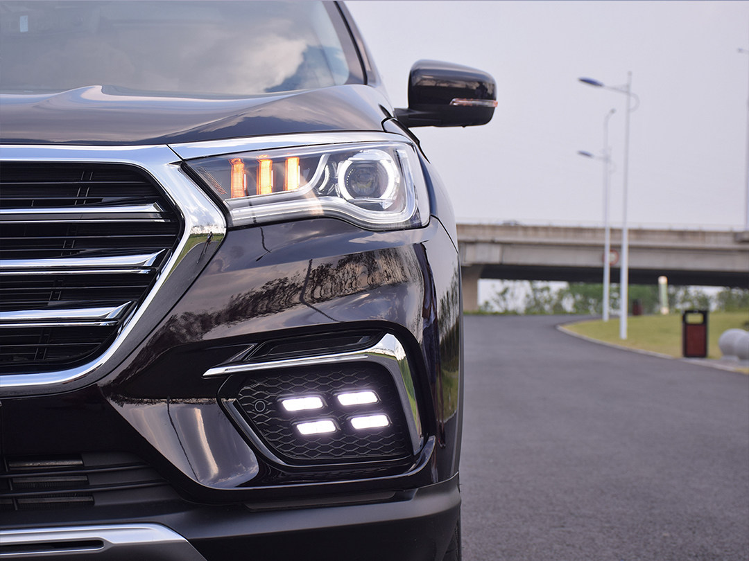 前大灯组采用了徽派建筑中飞檐翘角的设计元素,横向的镀铬条从中间向两边延伸,一直到左右前大灯的边缘,起到了横向拉伸的视觉效果。配置上,驾驶车远近光灯采用了LED光源。