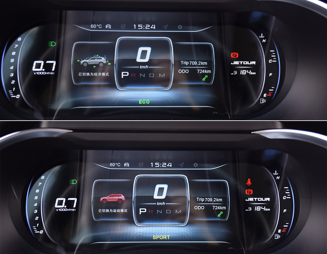 试驾车配备了12.3英寸的全液晶仪表盘,显示效果清晰,并且能够展示丰富的内容。而随着驾驶模式的切换,仪表盘左侧的车辆颜色也会做相应的改变,ECO模式下为环保的绿色,SPORT模式下则为激情的红色。