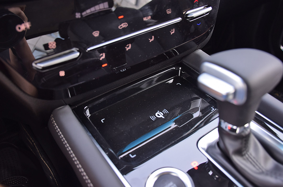 在挡杆前方是无线充电区域,经过测试,刚好能容下一部iPhone XS Max,再大的话就只能选择数据线充电了。