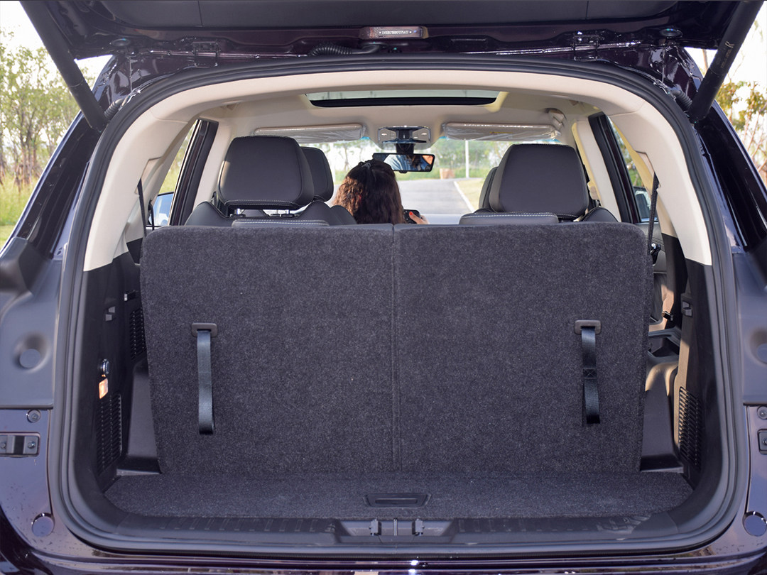 将第三排座椅放倒后,后备箱的空间便宽敞了许多,并且平整性也不错。如果想要获得更大的空间,可以把第二排座椅尽可能地向前移,但不支持放倒。
