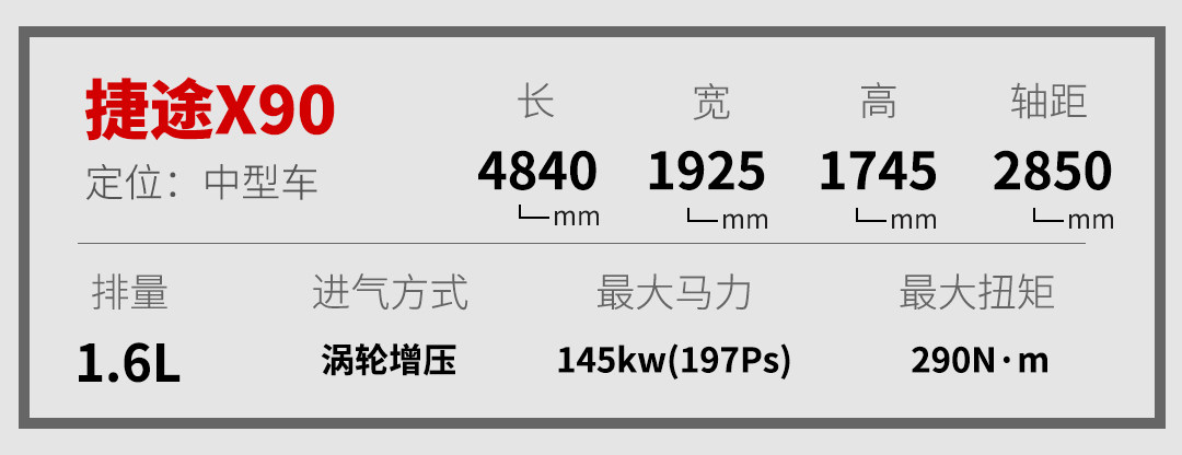 作为一款中型SUV,捷途X90的车身尺寸为4840/1925/1745mm,轴距达到了2850mm,在同级的车型中具有明显的优势。