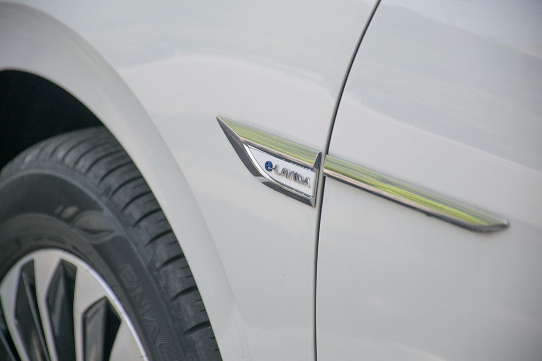 车头,翼子板以及车尾等处用“e-Lavida”铭牌强调其新能源车的身份,车尾保险杠处取消假排气装饰口。