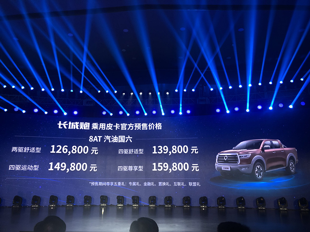 日前,长城皮卡公布了长城炮乘用皮卡的预售价格,本次开启预售的共有4款车型,预售价格区间为12.68-15.98万元,均采用了2.0T+8AT的动力组合。新车可在长城皮卡官网、京东/天猫长城汽车旗舰店进行预购。值得一提的是,在8月18日-9月30日期间,交999元定金,即可享受五重礼。长城炮是目前长城皮卡中定位最高的一款车型,整车外观饱满,力量感十足,在保留了皮卡特点的同时弱化了其工具属性。除了外观,新车内饰设计与用料更是向乘用车看齐,没有太多廉价感。动力上,新车搭载2.0T发动机,其最大功率190马力,峰值扭矩为360牛·米,匹配采埃孚8速手自一体变速箱,提供四驱系统可选。