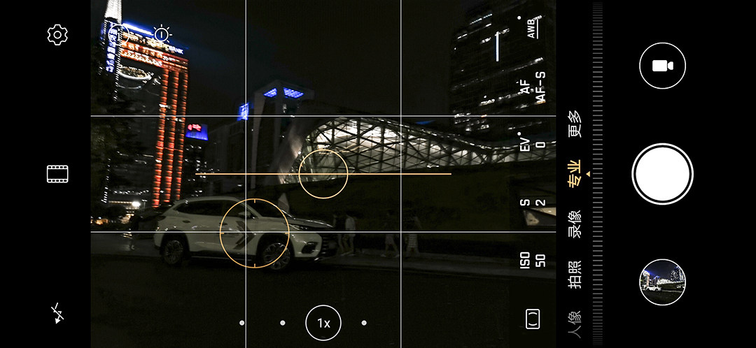 由于夜间光照较弱,如使用自动模式拍摄,系统可能会选择更高的感光度而提高画面亮度,但高感光度会导致画面中噪点增加,影响观感。此时使用专业模式拍摄,就可以将感光度限制在最低水平,并使用时间长达一秒以上的慢速快门拍摄夜景。