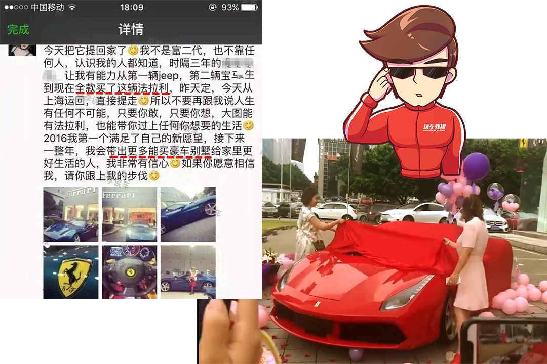 至于那些短期内能拿到车的客户,基本不会炫耀提车,因为他们满车库都是法拉利,所以那些昨天订车今天提车的,看看就好;如果你现在在做微商,并且有意愿买新款法拉利的,最好快点就去下定了,排期真的要很久,怕您成功了却不能马上开上法拉利发票圈~