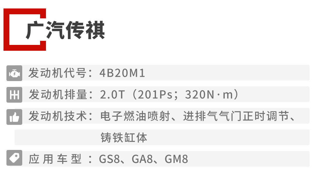 目前传祺的这台2.0T发动机主要运用在GS8、GA8以及GM8上,其最大功率为201Ps,峰值扭矩为320N·m。