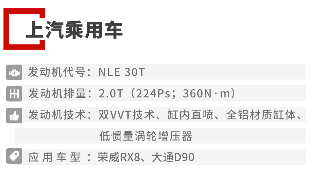 目前上汽的这台2.0T发动机主要运用在荣威RX8以及大通D90上,其最大功率为224Ps,峰值扭矩为360N·m。