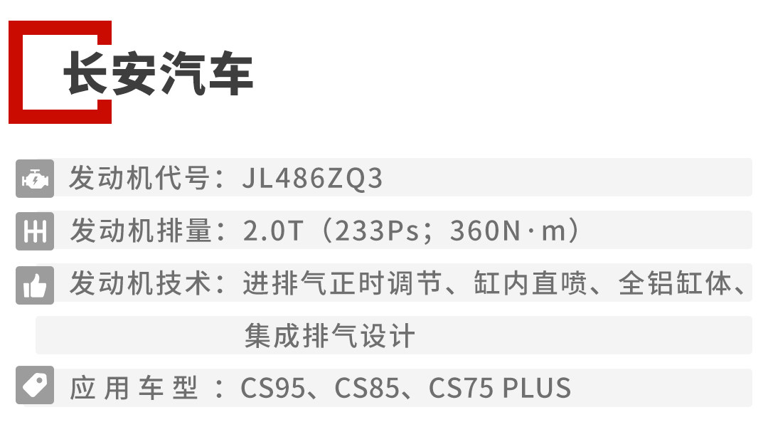 目前长安的这台2.0T发动机主要运用在长安CS95和CS85上,而即将上市的长安CS75 PLUS高配车型也将搭载该款发动机。其最大功率为233Ps,峰值扭矩为360N·m。