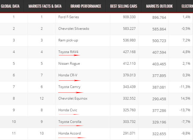 实则我被打脸了,通过美国汽车销量排行来看,福特F系列皮卡取得了销量冠军这并不奇怪,皮卡在美国是刚需,能载人又能拉货,农场主最爱。但是销量前十中日系车占六席是怎么回事,RAV4、奇骏、CRV、凯美瑞、思域、卡罗拉、雅阁(第十一名),这些不都是中国人爱买的车吗?