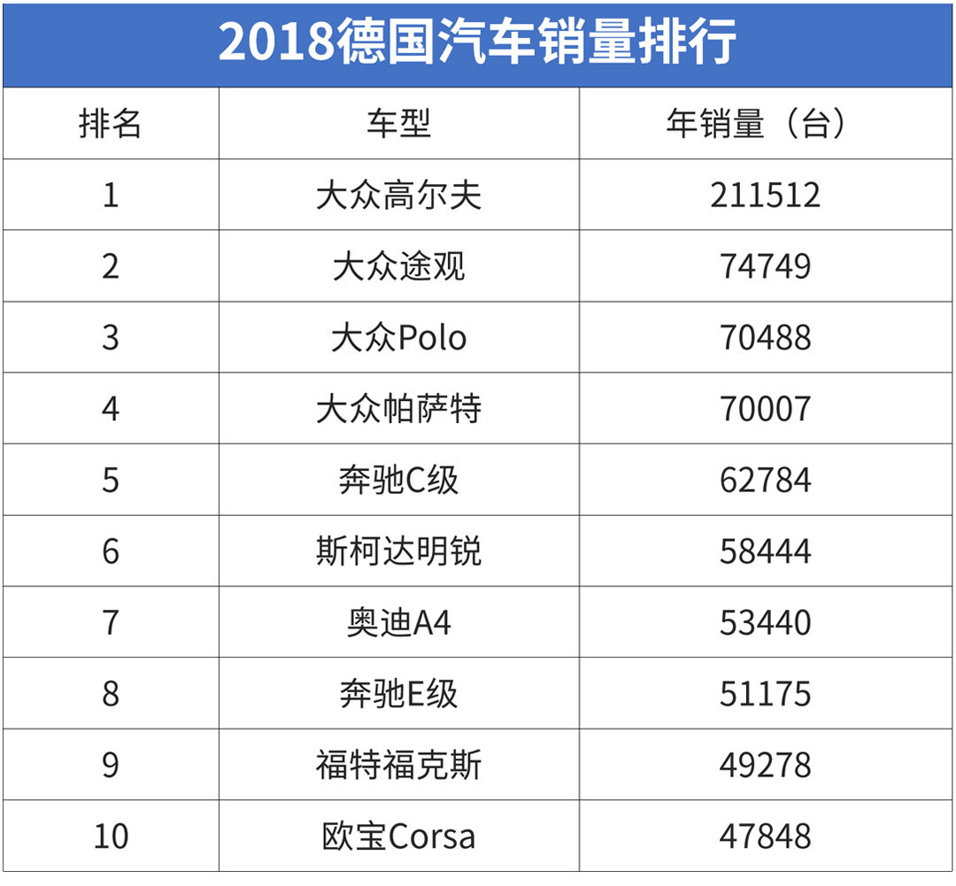 实则我漏了一个品牌,大众虽然在美国卖得不怎么样,但在大本营-德国,销量直接霸榜前四,第一名高尔夫一年可是卖了21.5万台,要知道德国人口不到九千万,可见德国人民对高尔夫的喜爱。第二到四名分别是途观、Polo、帕萨特(国内迈腾),奔驰和奥迪在第五名和第八名,看来本土优势还是很大的。