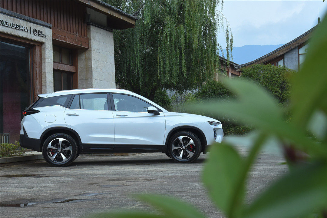 外观灵感取自于“猎豹”仿生学设计,“豹脸”的前脸造型相当激进。居中的点阵式星空格栅近看仿佛置身于万马千军的阵列当中,远看又犹如猎豹张开的“血盘大口”,搭配两侧细长且目光锐利的日间行车灯,活灵活现的真豹子是也。