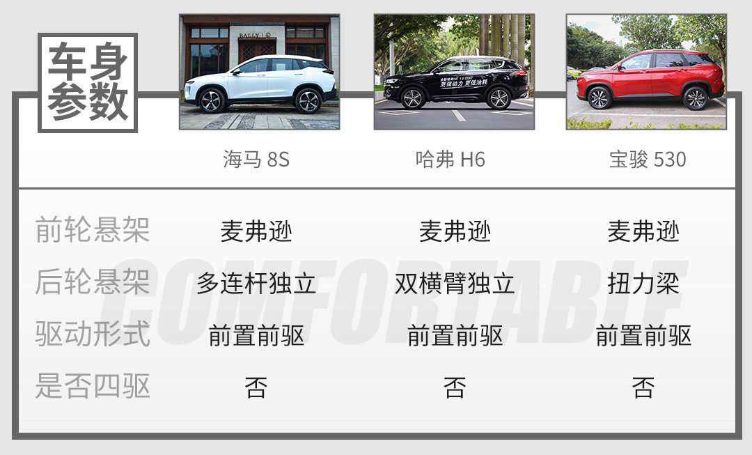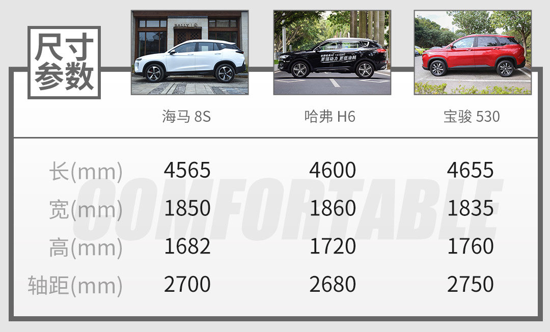 海马8S的尺寸参数在与同级主要竞品对比时没有占据明显的优势。