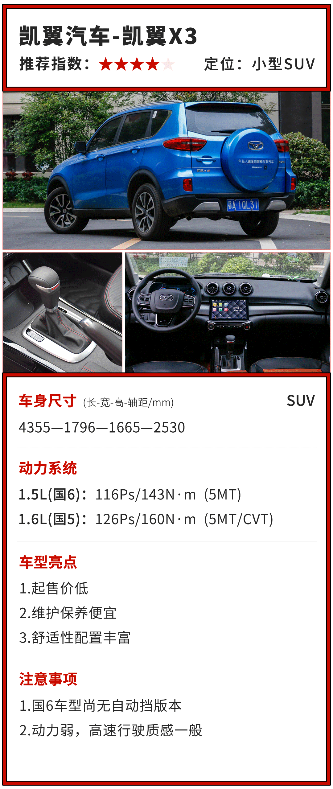 但比较遗憾的是,凯翼X3的国六车型目前尚无自动挡版本可供选择,而且马力数字和价格摆在那儿,动力感受难免比较弱,高速行驶质感就不要有太多期望了,它只是一款适合拿来在三四线城市代步的车。