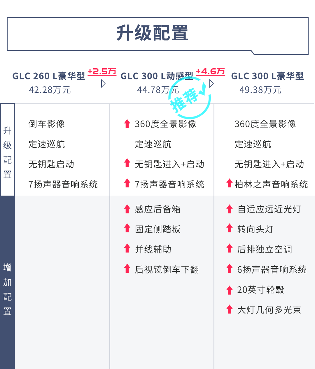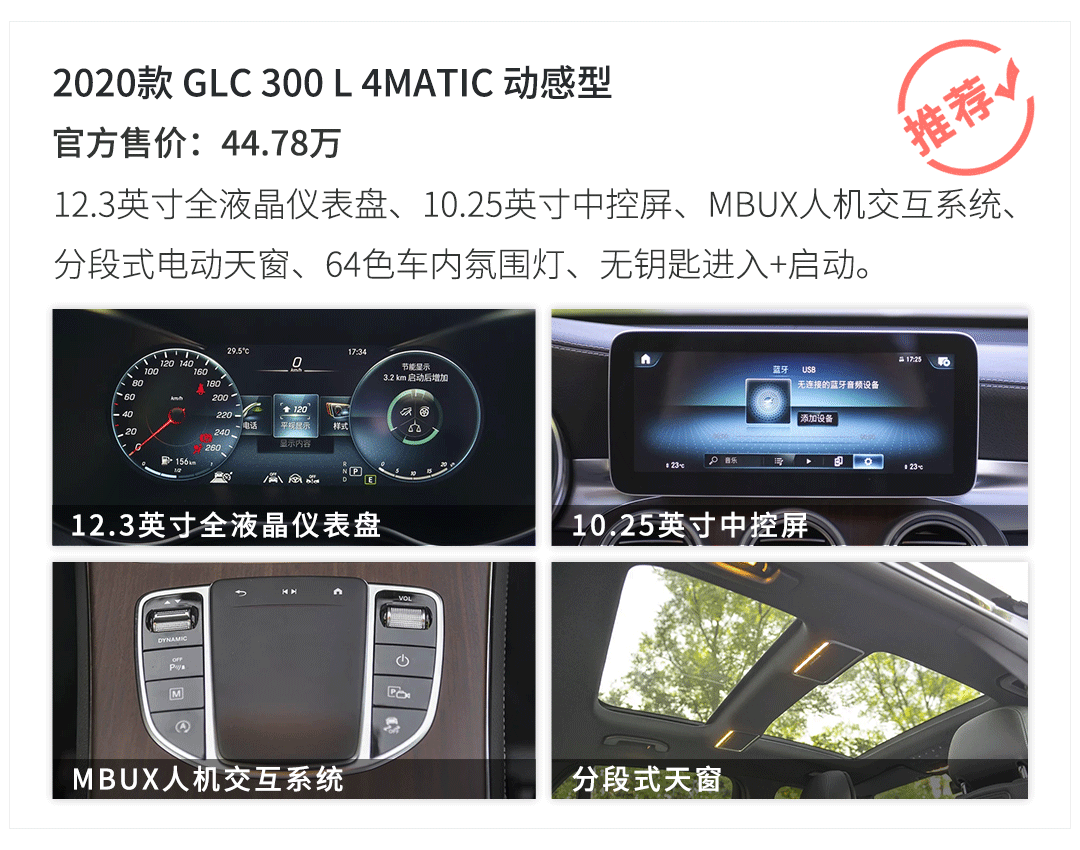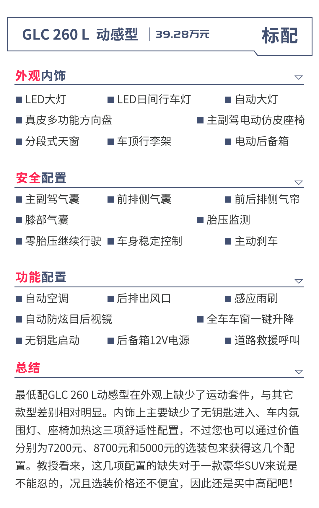 想标配座椅加热和车内氛围灯,需要购买次低配的GLC 260 L豪华型;而不用掏钥匙开车门的无钥匙进入功能,你最少得购买GLC 300 L动感型才能拥有。再往上的两个款型,主要多加入了一些锦上添花的舒适性配置,且为了购买这些配置得多花好几万甚至小十几万,不太值得。