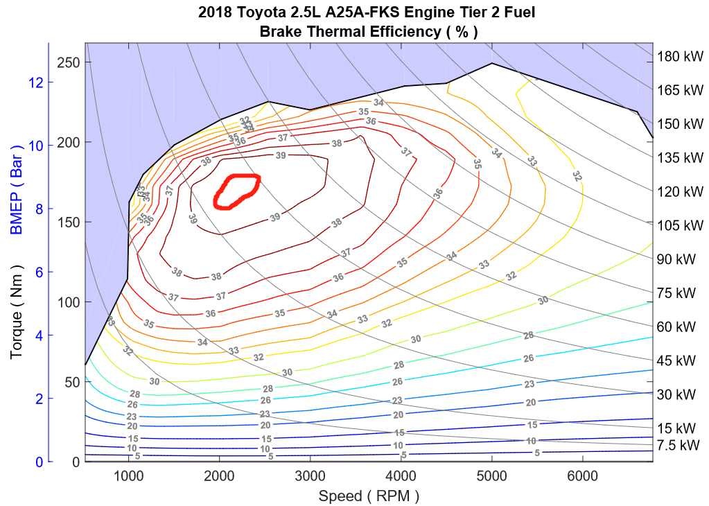 最高热效率也是一个道理,它只是在发动机状态最好的时候才有,一般这个最佳状态很短暂也可以说很小。更直白一点说就是,只有很小一部分情况发动机才处于最佳效率区间。