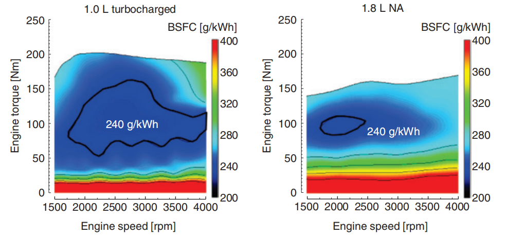 另外我们再看看思域的1.0T发动机,虽然最高热效率不是很抢眼,但是再大部分情况下发动机都处于高效运转工况(大约35%热效率),对比之下,以前的1.8L自吸发动机同效率区间就很小,这也是为什么很多厂商要做小排量增压的原因。