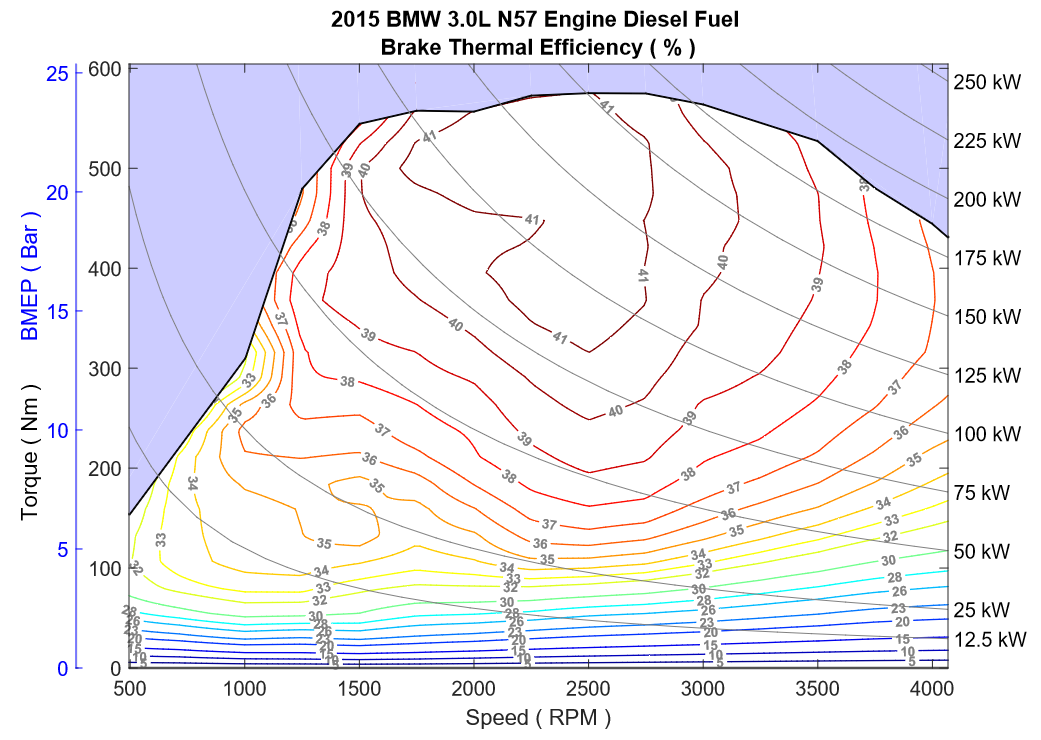 既然说省油是柴油发动机的强项,那么现在的柴油发动机能做到什么水平?我们以宝马5系的3.0T柴油发动机(N57)为例,它的最高热效率已经接近42%,而且大部分工况都处于40-41%(上图40-41数字的圈圈内)的热效率下运转,对比前面的丰田2.5L发动机,无论是最高效率还是工况范围都有碾压优势,况且N57还是5-6年前的产品。
