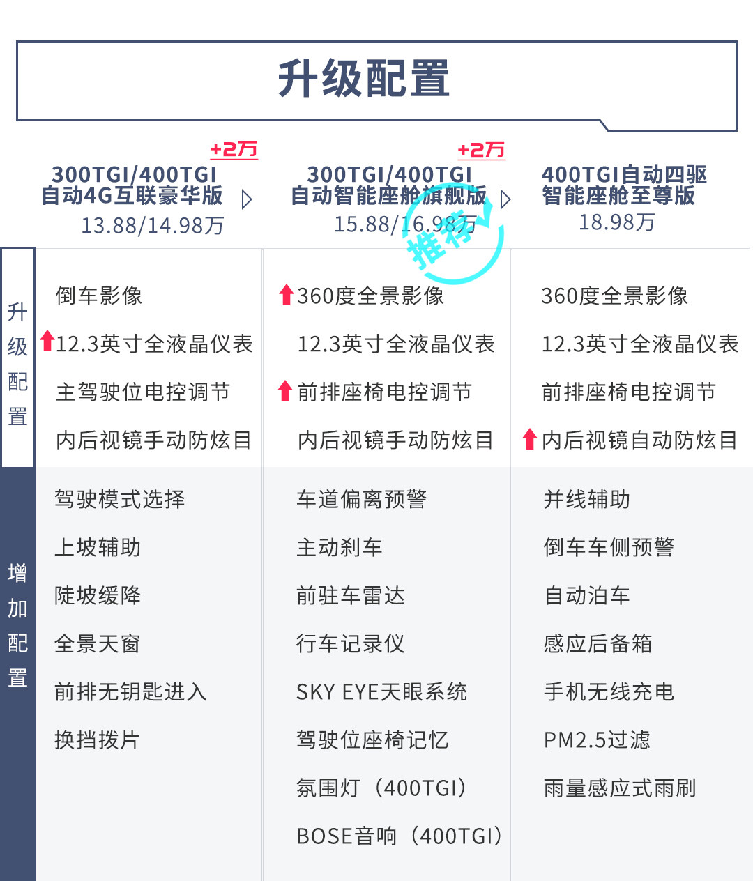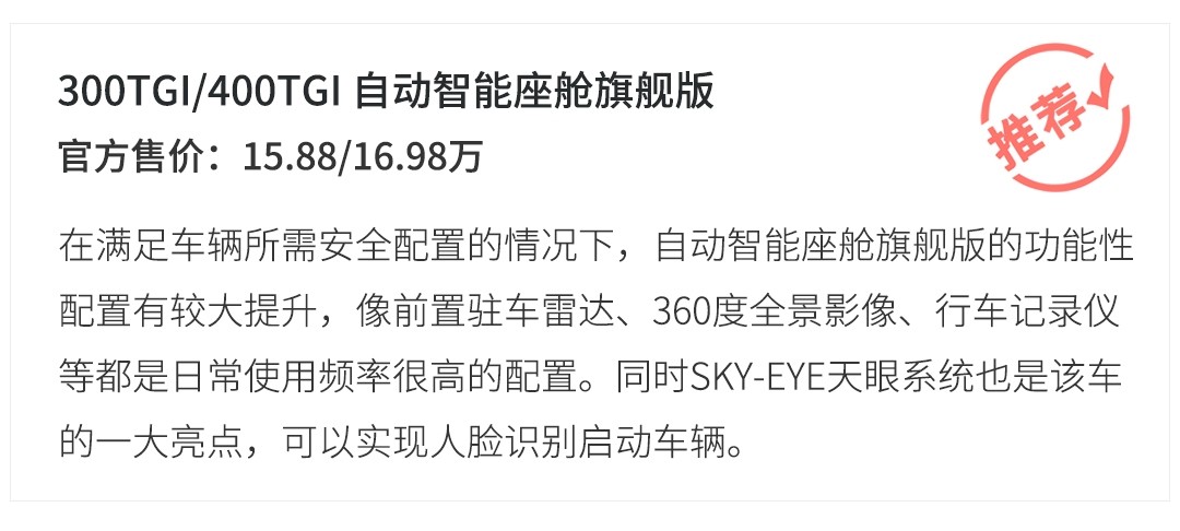 在9款车型中,虽然有区分300TGI 和400TGI动力版本,但不同动力的自动4G互联豪华版、自动智能座舱旗舰版等车型存在配置重叠,整体都有着比较高的配置全面性。其中比较值得推荐的是自动智能座舱旗舰版车型,而动力方面的选择则可根据自身的用车习惯和需求进行选择。