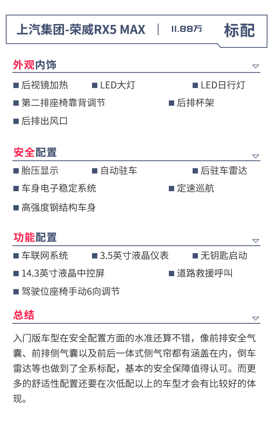 荣威RX5 MAX在11.88-18.98万的售价区间内提供了9款车型选择,售价介于RX5与RX8之间,而动力的选择上除了搭载与RX5相同的1.5T版本,另外还提供了2.0T动力版本以及四驱的选择。