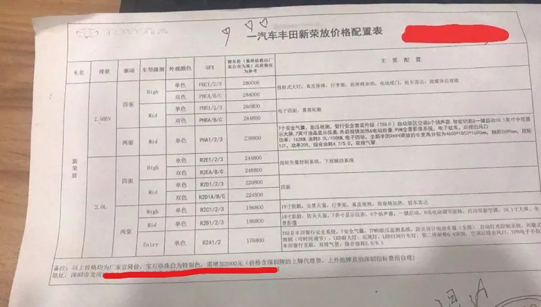 近日有相关媒体曝光了疑似一汽丰田RAV4的售价,从曝光的图片可以看到,2.0L车型参考价格为17.68-24.48万元,2.5L混动车型参考价格23.88-28.40万元。两种车型均有四驱版提供。新车此前已于2019上海车展正式发布,外观内饰基本沿用了海外版车型设计,据此前消息,新车将于10月正式上市。新架构所带来的利好已在丰田其他新款车型中有所体现,因此RAV4的吸引力十分大,如果以目前曝光的疑似售价作为参考,相信新车的市场竞争力不容小觑。