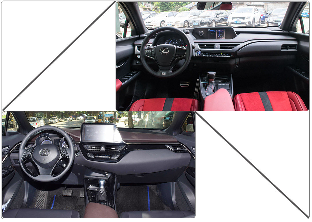 的确,仅从外观来看这两车各有亮点,C-HR线条复杂、青春活力。UX则要沉稳很多。内饰应该是最明显的差异,雷克萨斯UX的内饰并不张扬,不过皮革、石英钟表等物件的修饰让它不坠豪车的名头。C-HR悬浮式中控屏视觉效果也不差,不过在用料上、触感上不及雷克萨斯UX。
