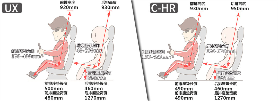 虽然雷克萨斯UX号称紧凑型SUV,但它的轴距与C-HR一样都为2640mm,所以后排的空间表现跟C-HR其实是差不多的。后排腿部空间不大,几乎就要顶到前排座椅了,视野及光线一般,多少会有压抑感。这两辆车作为家庭用车其实并不是好的选择。