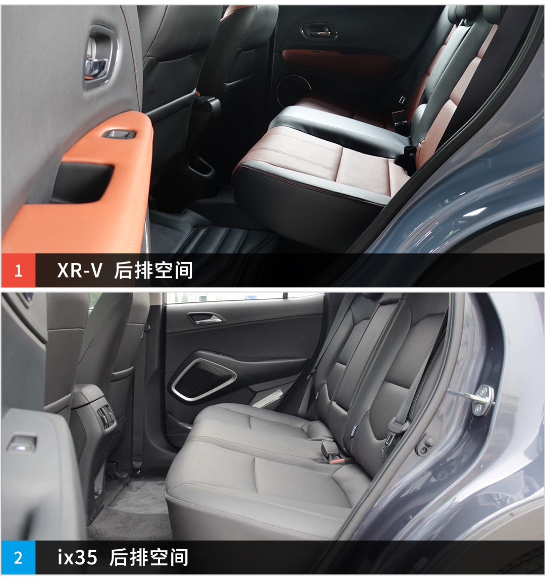 既然两者尺寸差不多,但却是不同的级别,那么相信大家更加关注的是它的后排空间到底如何。实际测试下(测试员身高180),在保持前排座椅位置不变,XR-V后排腿部空间大概有一拳3指左右,而ix35则是在两拳左右。看来无论XR-V再怎么神,物理限制还是无法突破。不过XR-V的坐垫乘坐感会比ix35好不少,包裹性也更高。