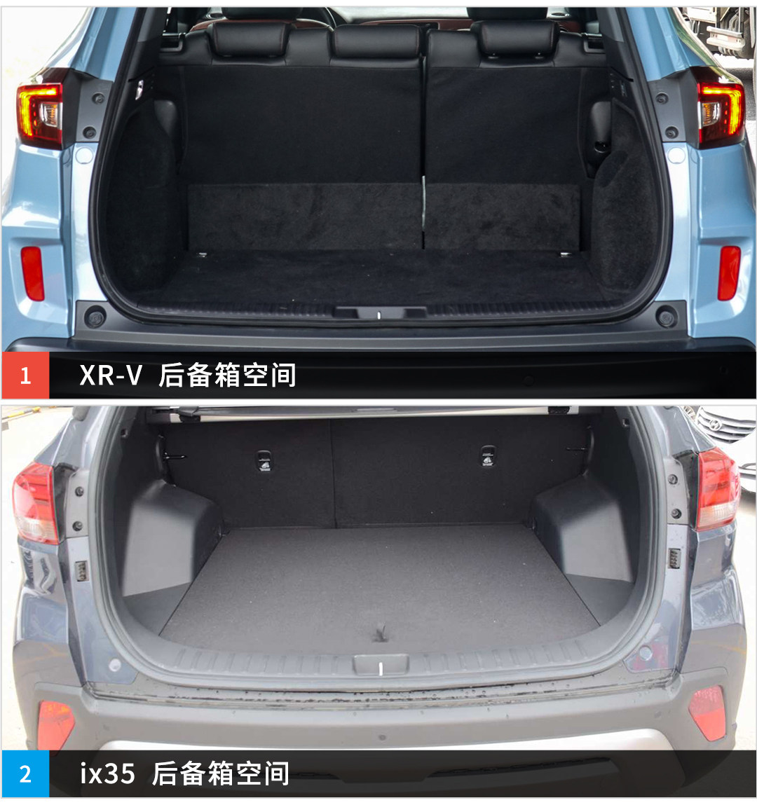 既然说到SUV了,不说后备箱空间好像也过不去,两者这时候的区别变得更加明显。只是XR-V更好得遵循本田MM理念,是的真正在使用上,两者的区别会缩小。当然还是那就,ix35有着天生优势。