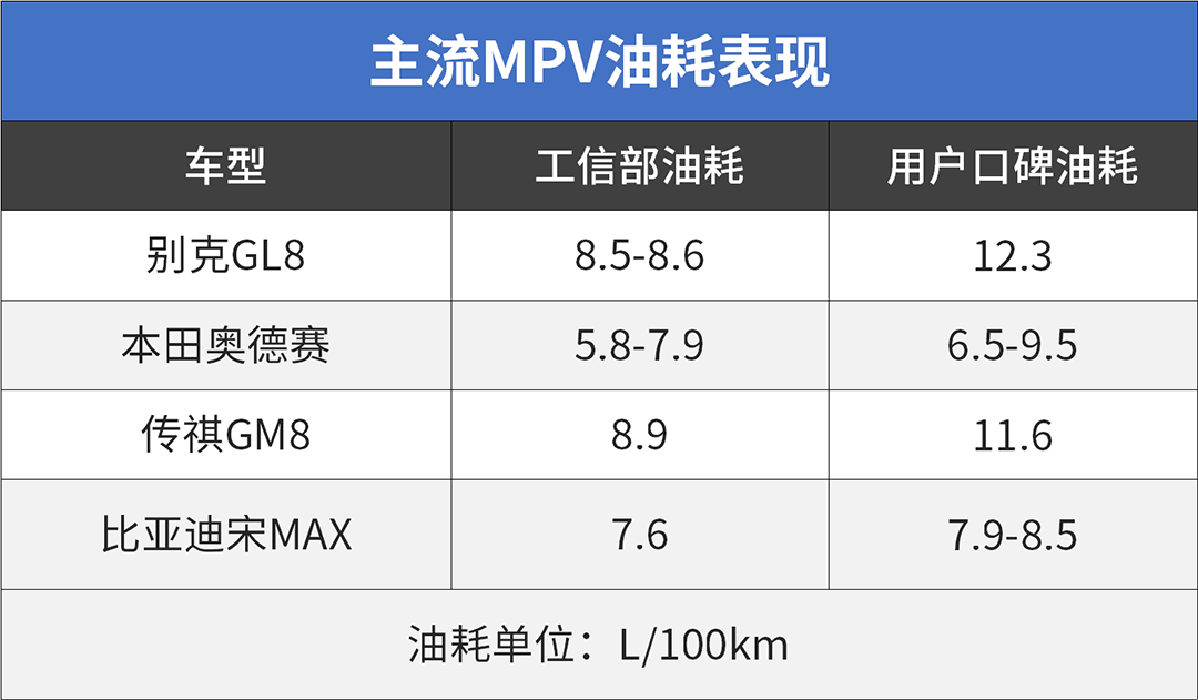 可以看到MPV车型的油耗相比较同价位的轿车和SUV来说,确实要更高一些,尤其是奥德赛、GL8等主流产品更是夸张,这样的油耗对于一般消费者来说并不划算。