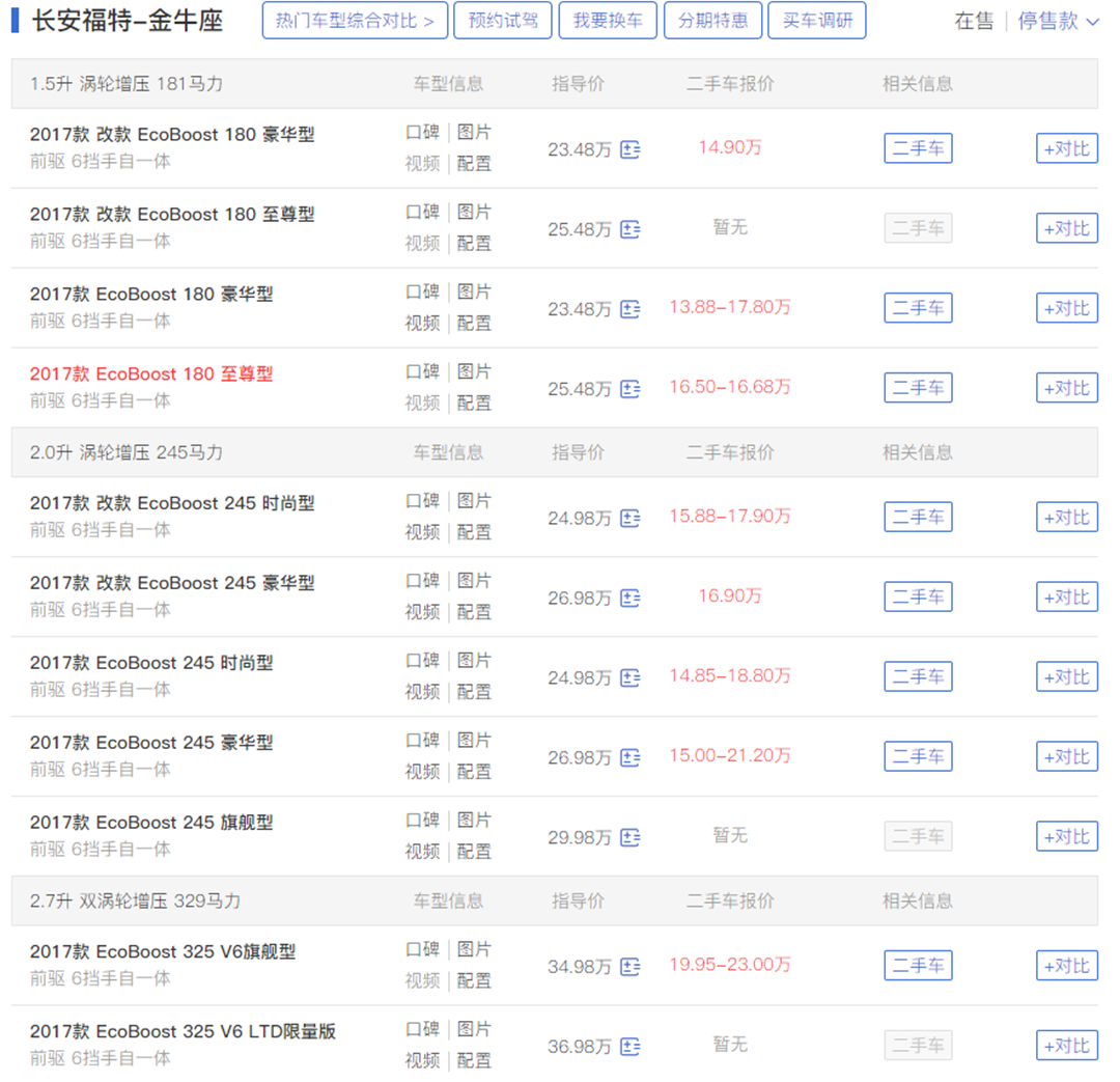 以2017款金牛座为例,1.5T车型起售价23.48万,这都能买到同为中型车定位的同年款丰田凯美瑞、大众迈腾等车型的2.5自吸高配或2.0T高功率版车型了;而2.7T V6车型售价最高达36.98万,也与宝马3系、奥迪A4L这些豪华品牌中型车的主力销售款式价格重叠。