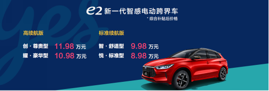 9月2日,新能源汽车引领者比亚迪旗下e系列首款跨界车型e2盛大上市。上市发布会以“Yes 年轻就该电动”为主题,e2定位于“新一代智感电动跨界车”,全系标配智能网联系统,以设计加乘、高效加乘、智能加乘、安全加乘、舒享加乘五大同级领先优势发力,致力于成为更多年轻消费者的第一台车与更多家庭的第二台纯电动车。新车共推出标准续航版本的悦·标准型、智·舒适型以及高续航版本的耀·豪华型、创·尊贵型共4款车型,官方指导价8.98万-11.98万元。