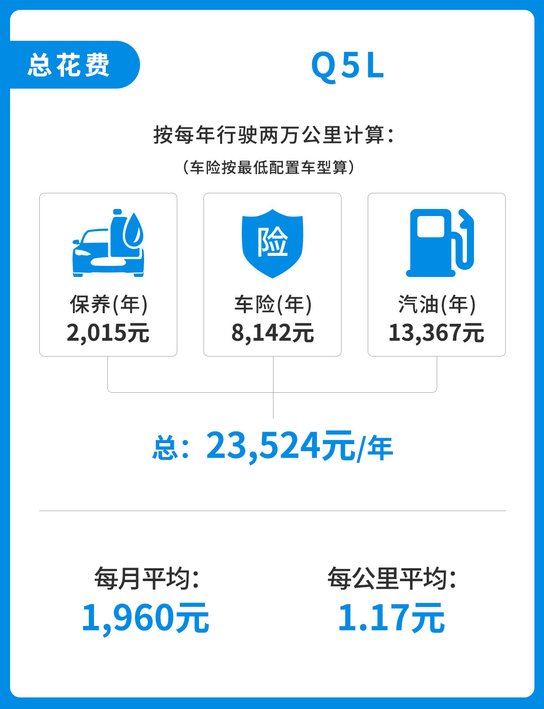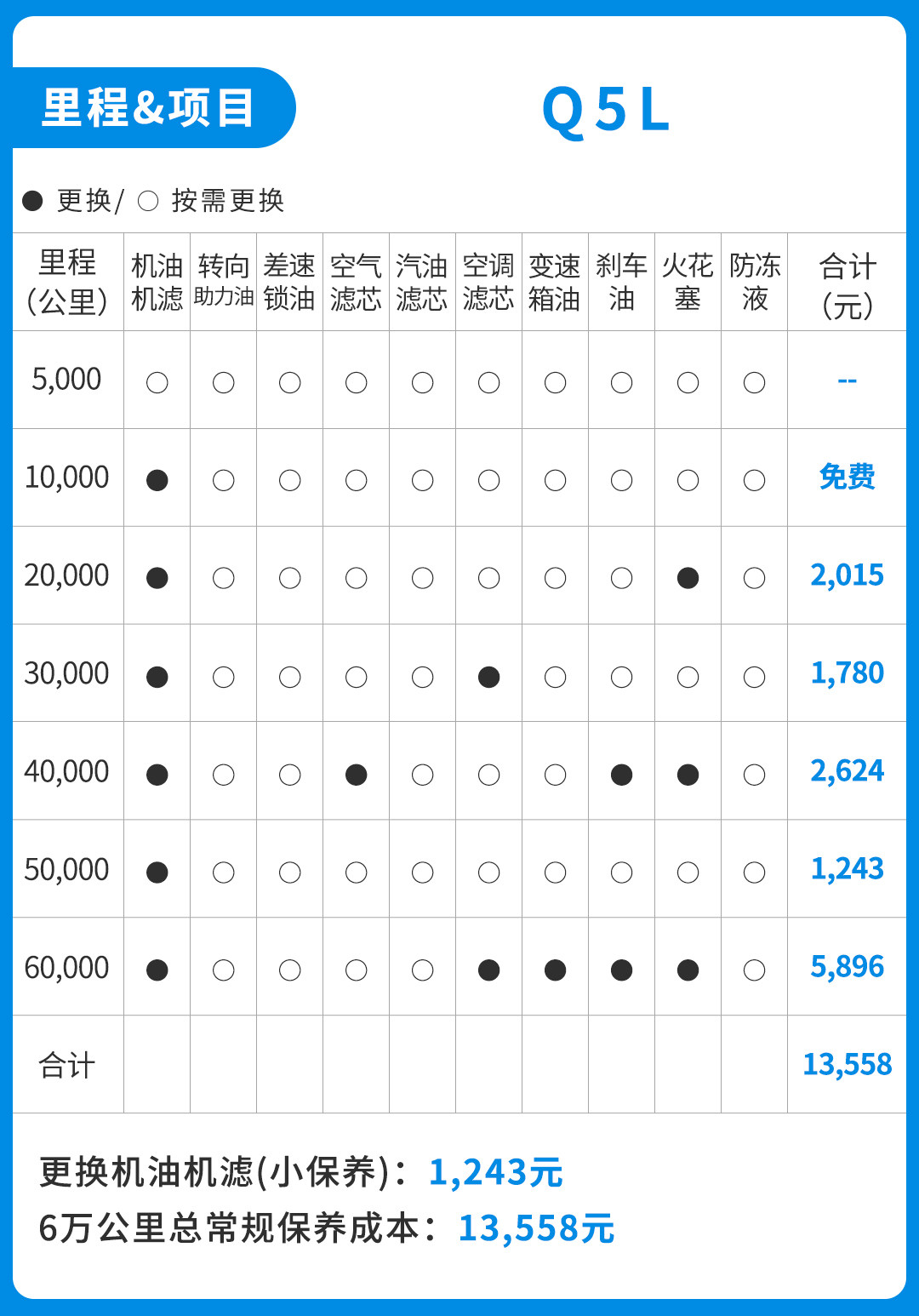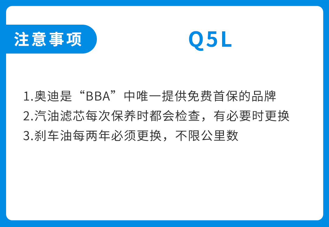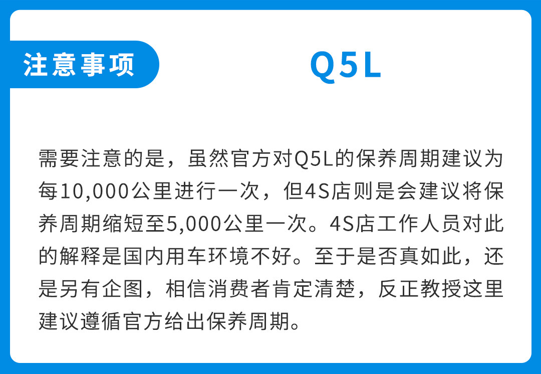 如果不是4S店那边的问题的话,Q5L真的非常值得推荐,尤其在保养费用对比宝马X3,更是突出它的性价比,这还没说Q5L常年都有的高优惠。但买车就必须经过4S店,而4S店建议的每5,000公里一次的保养周期不仅过短,还会让保养费用急剧上升。所以对Q5L感兴趣的朋友,在购买时一定要跟4S店商量好保养方案,就算有钱也不是那么乱来的。