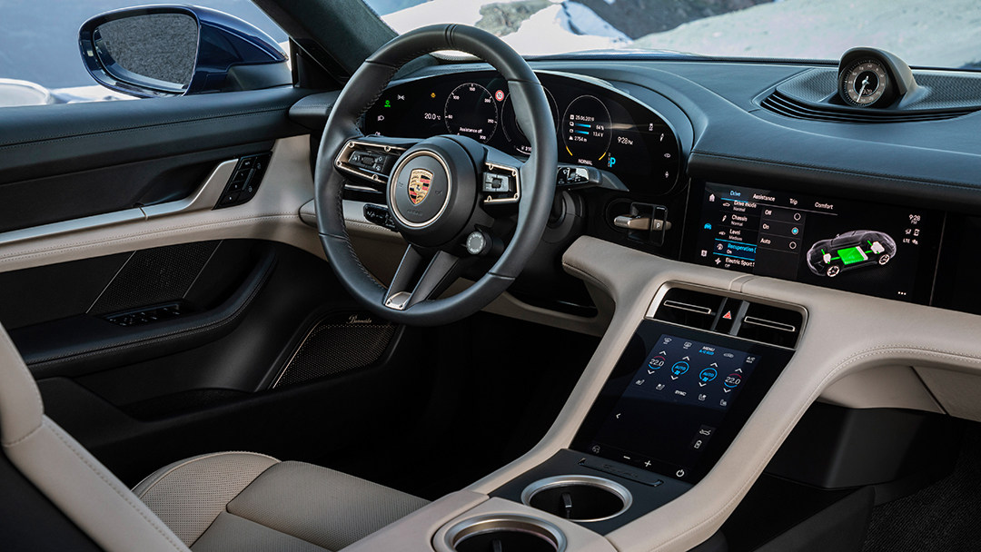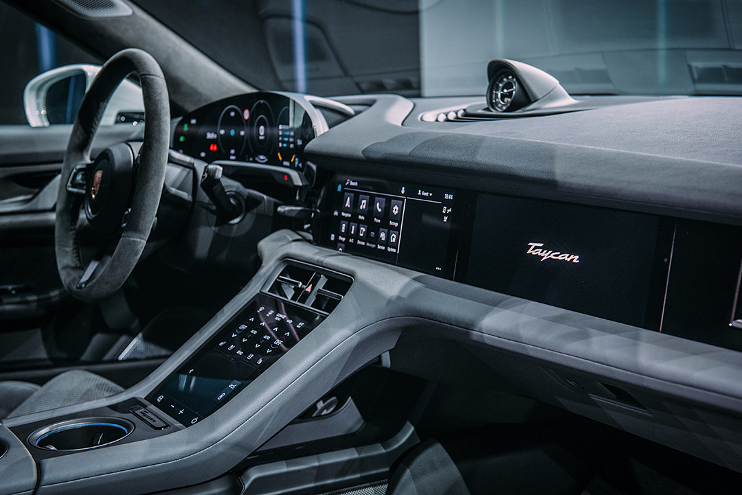 敞开车门,进入舱内,保时捷Taycan内饰设计依旧沿袭了概念车Mission E,最抢眼的当属四块液晶巨屏,提供优良视觉效果的同时科技感满溢。假若选装了保时捷Sport Chrono组件,那其上的物理指针将成为舱内唯一的传统仪表。