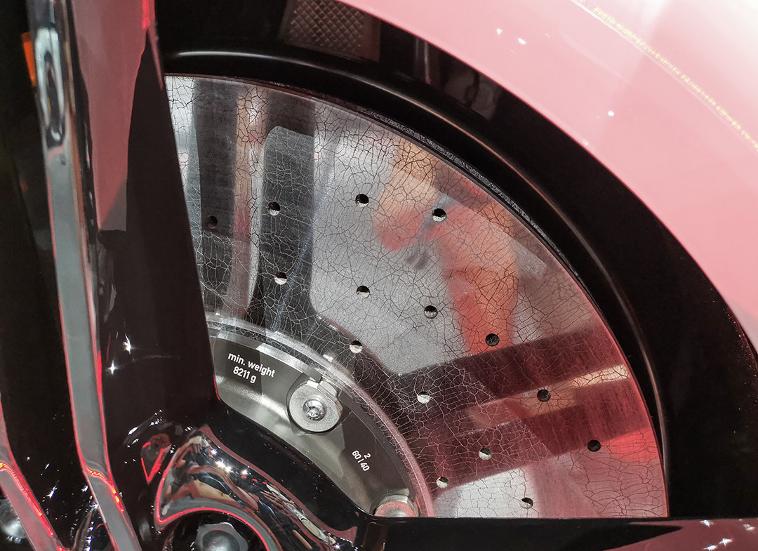 Taycan Turbo S配备复合陶瓷制动系统(PCCB),前制动盘直径420mm、后制动盘直径410mm;而Taycan Turbo则标配保时捷表面镀层制动系统(PSCB),前制动盘直径415mm、后制动盘直径365mm。