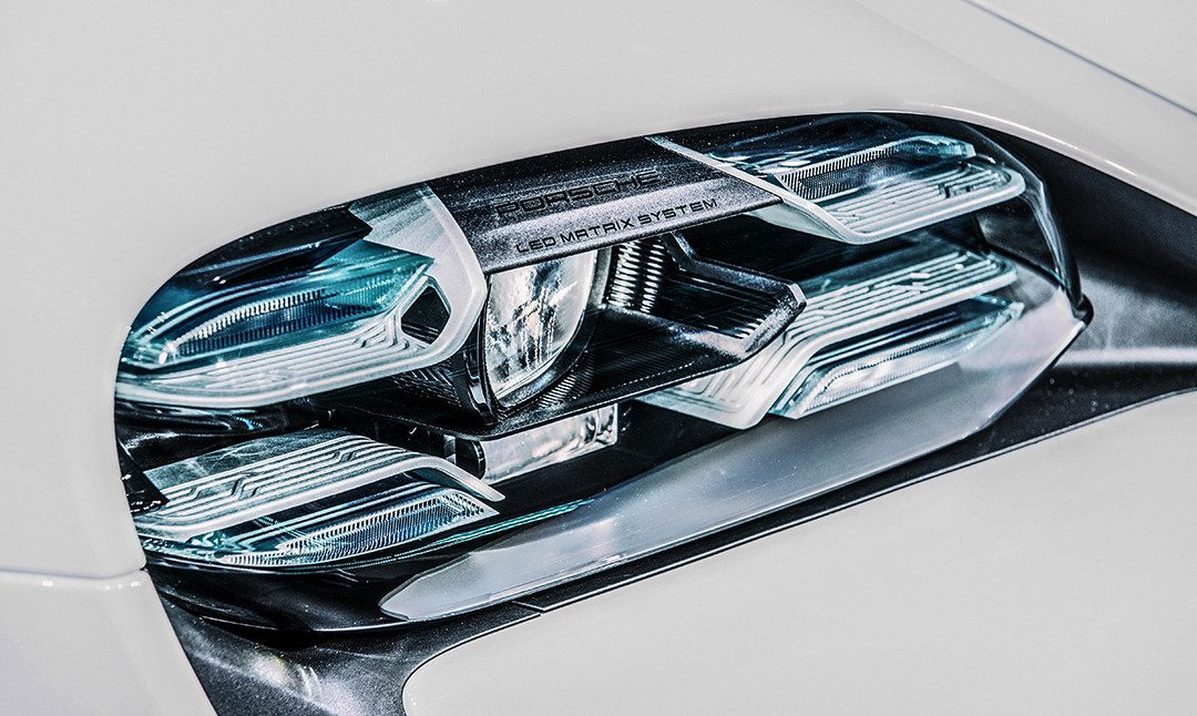 前脸最引人瞩目当属激凸的“四点式青蛙头灯”,官方称其为“Porsche LED Matrix System”(保时捷LED矩阵系统),无灯罩设计尤为大胆,硕大的LED单元分别位于灯腔内部四角,周边点缀了带电路状纹路的精致银色饰板,未来感满溢。LED矩阵还可单独点亮/关闭,防止对向驾驶员眩目。