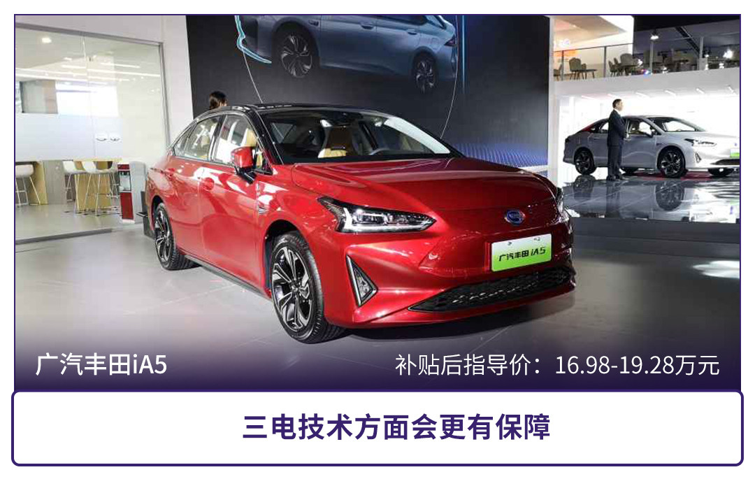 9月5日,广汽丰田iA5正式上市,新车补贴后售价16.98万元-19.28万元,共提供了3款配置车型。新车为广汽新能源Aion S 的姊妹版车型。新车采用Aion S的的设计语言,但在细节方面有所不同。新车尺寸为4792/1880/1530mm,轴距为2750mm,长度比Aion S 增加24mm。在动力上,最大功率为184Ps,新车将搭载由宁德时代生产的三元锂电池,综合续航高达510km。